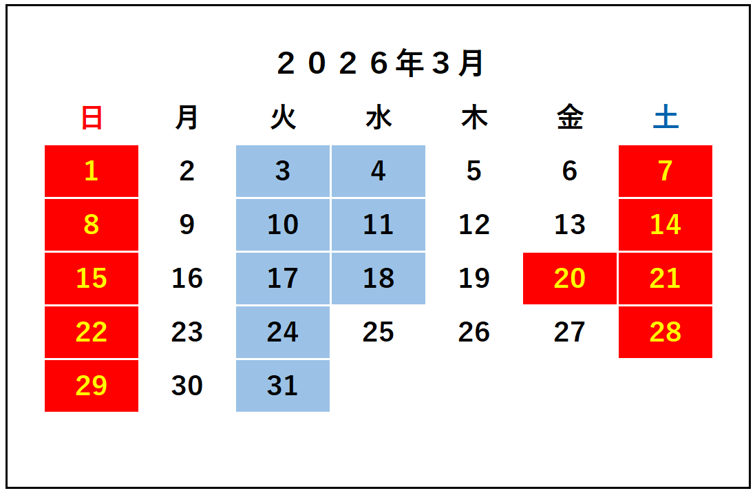 営業カレンダー : 🔶フェア開催日 🔷休業日